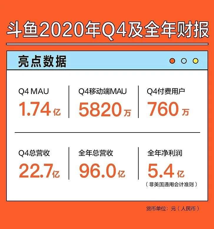 根据3月23日发布的截至12月31日的2020年四季度及全年财报,斗鱼在2020年的全年表现良好:营收为96.01亿元,同比实现了72.83亿元的增长,同比增长31.8%。非美国通用会计准则下经调整后归属于斗鱼的净利润为5.42亿元,同比增长56.3%。