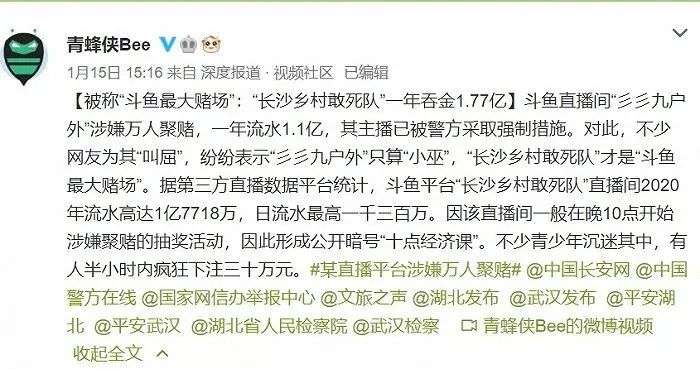 1月15日,斗鱼主播“长沙乡村敢死队”被爆出长期利用斗鱼直播平台的抽奖机制,变相进行涉嫌赌博的活动。其专门用于涉赌行为的小号在开播9天内流水已经高达1383.5万元。这种“涉嫌赌博”的实际玩法是直播间观众购买指定道具打赏主播后,就可以参与彩票式的虚拟货币(鱼翅)抽奖,抽中虚拟货币奖励又可以通过第三方兑换成现金,单笔最高可以赚5万,巨大的吸引力引得许多人变成赌徒参与其中,甚至有用户半小时在“长沙乡村敢死队”的直播间下注30多万人民币。