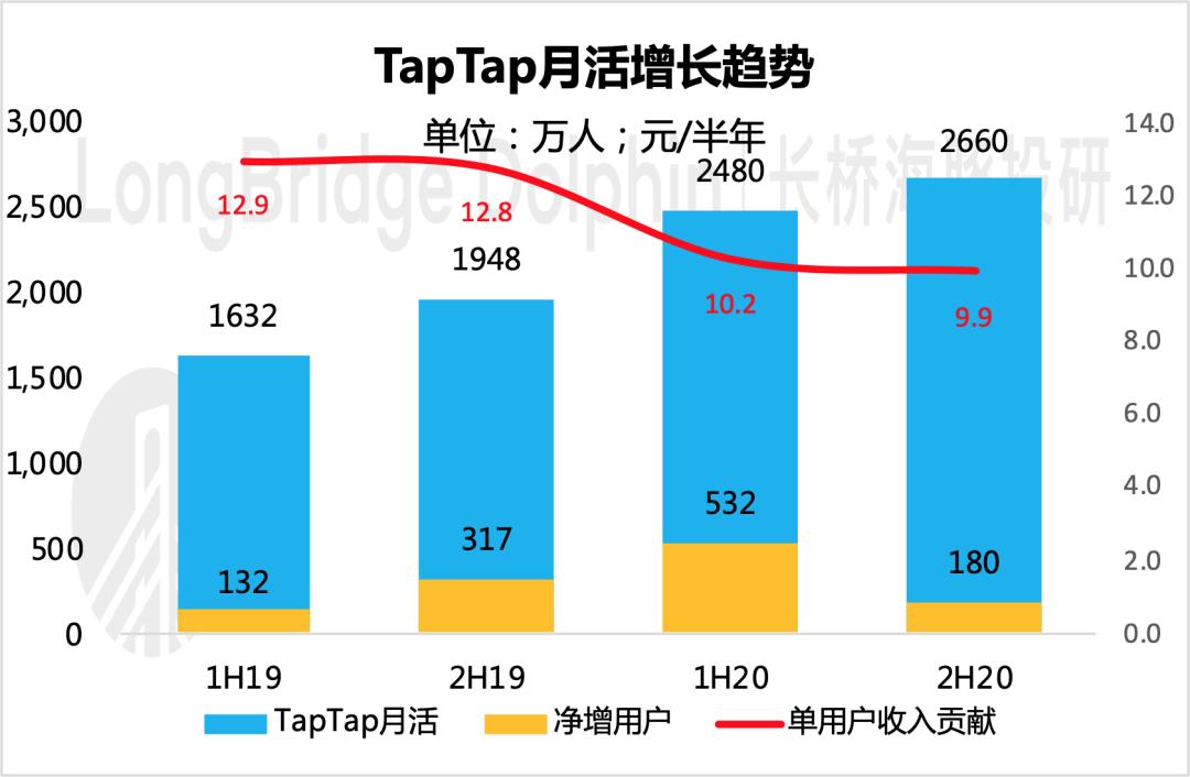 2020全年TapTap的平均月活2570万人,同比增长44%。但让我有点忧心的是,下半年增长与上半年相比并未如期加速,反而有所放缓。
