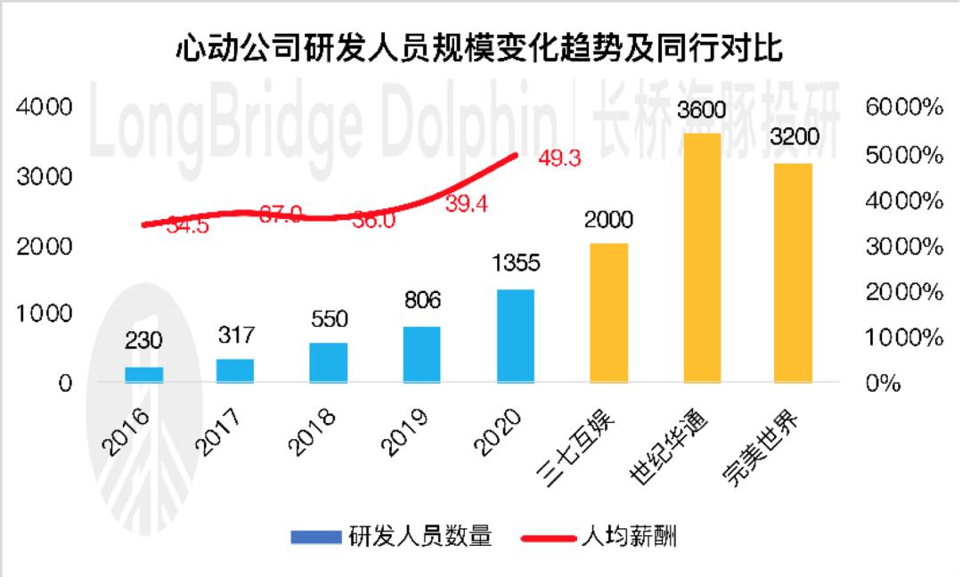 (3)此次影响利润最大的因素在于研发投入。业绩预警中提及,此次研发费用大增主要是研发人员规模翻倍增长。2020年心动研发投入达到6.58亿元,按照年底研发人员1355人的规模测算,人均员工福利差不多万元50万/年,在行业中处于较高水平。
