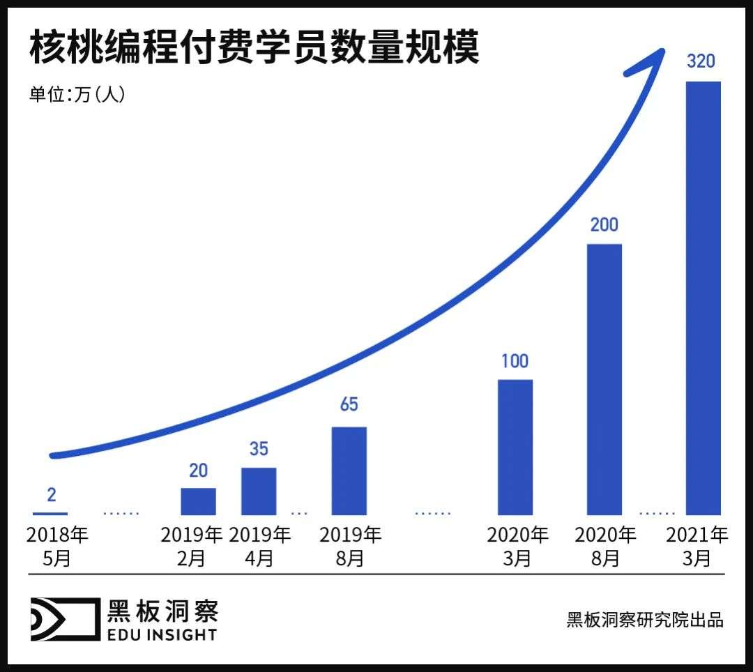 那么,这块蛋糕究竟有多大呢?研究表明,目前少儿编程市场规模预估有40亿元,学员规模1500万人左右。预计未来5年,市场规模将有望达到300亿元,尤其在竞赛及相关学科政策的牵引下,家长对少儿编程的接受度与支付意愿还在逐步提升。仅看核桃编程一家企业,付费学员数量就从最初2万多人增长到如今的320万之多,要知道这不过才用了短短三年时间而已。家长对给孩子报名少儿编程课程的高涨热情可见一斑。