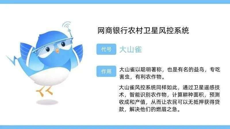 如去年9月,阿里推出了“大山雀”:一套以卫星遥感技术为基础的农村金融风控系统。这项技术可以高效率完成土地资产统计、农业估产等。在金融领域的应用上,有助于农户获取农业贷款,从而提升农户在种植过程中的采购意愿。