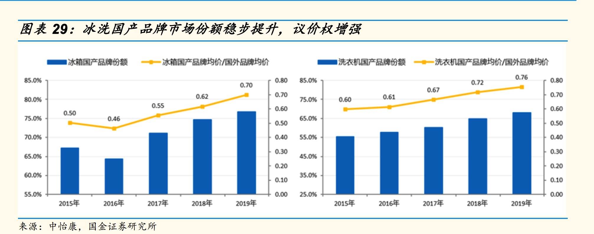 譬如在白电行业,我们发现国内品牌在市场份额稳步的同时,相对于国外品牌的均价不断提升,在空调行业定价甚至超过了外资品牌。这背后是国货长年的技术积累、产品创新以及品类布局。