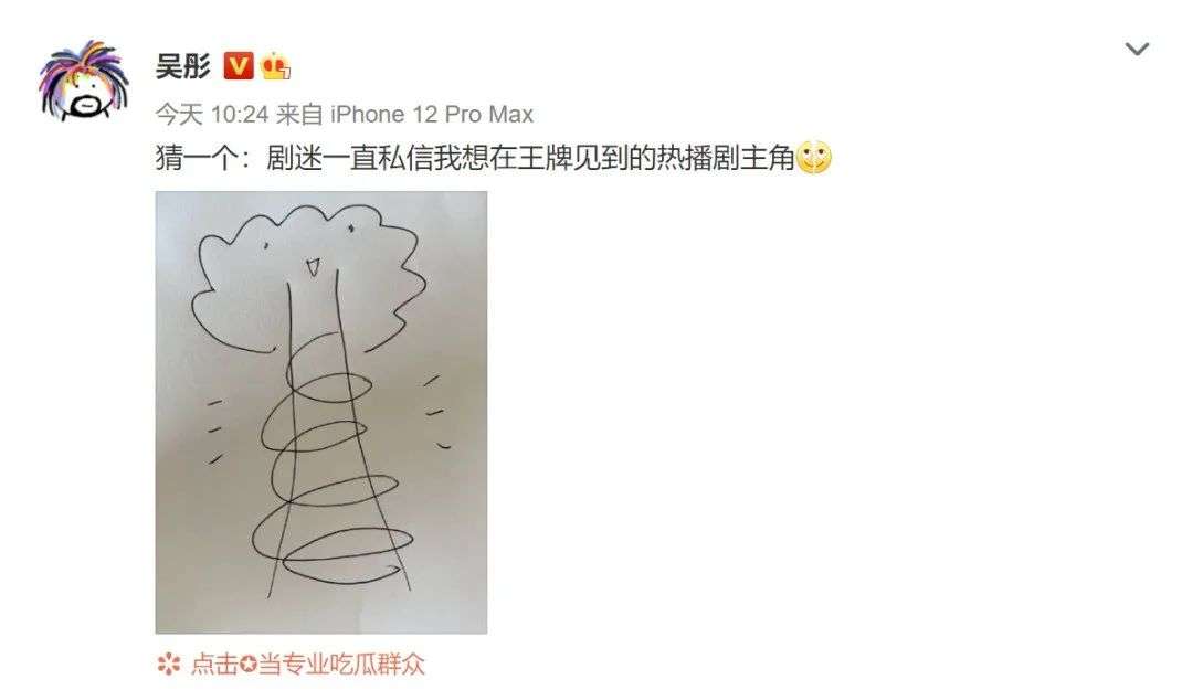3月26日,吴彤在自己的微博发了一张简笔画,让网友猜剧迷想在《王牌对王牌》见到的热播剧主角。随后,《司藤》主演景甜给吴彤评论:“你可以把这图作为头像吗?”短短一问一答,#景甜让吴彤把司藤作为头像#便登上了热搜。