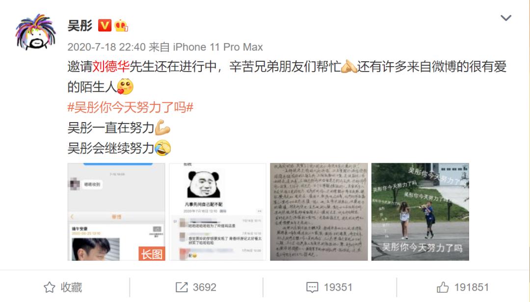 网友们用#吴彤今天努力了吗#,督促他帮贾玲追星刘德华;吴彤换了新卡通头像,网友说像长了胡子的杨迪;《王牌对王牌》里游戏输了的唐嫣,被吴彤要求发一张最爱的人的丑照,结果唐嫣发了一张吴彤自己的表情包。