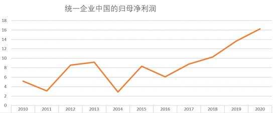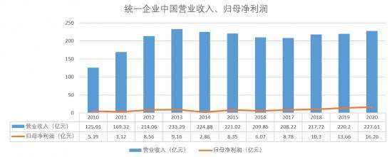 据统一2020年财报显示,公司营收为227.61亿元,较去年上升3.4%;净利润为16.25亿元,较去年增加19%,净利润仍有较大的增长空间,但营收规模却陷入缓慢增长。