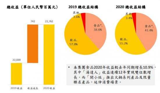 比起统一的食品业务,其饮品业务受新品类的冲击更大。2020年,统一的食品业务收入较去年同期增长10.9%,其中,方便面业务收入同比增长7.2%。而统一的饮品业务占整体收益比重的55.2%,年度收入为125.6亿元,较去年同期下滑1.3%。