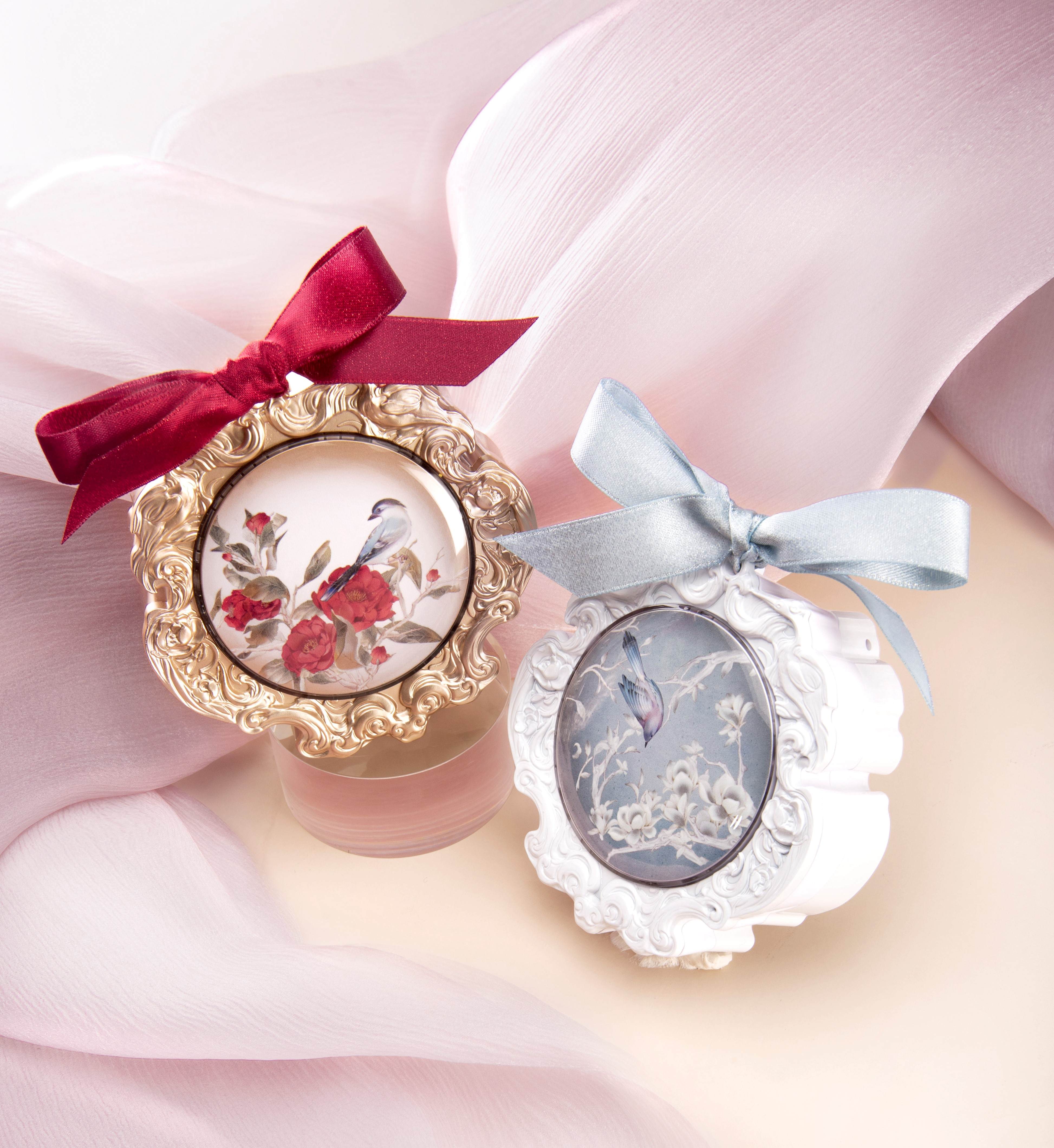 从最后的实物图可以看出,新系列的实物图选择了饱和度较低的莫兰蒂色系,结合了一些传统元素,如国画状态的牡丹、兰花、鸟等。同时彩妆盘边缘浮雕的设计成白色和金色的合金框,与此前小天使的设计呼应,让用户一眼能感知出“这是花知晓的产品。”