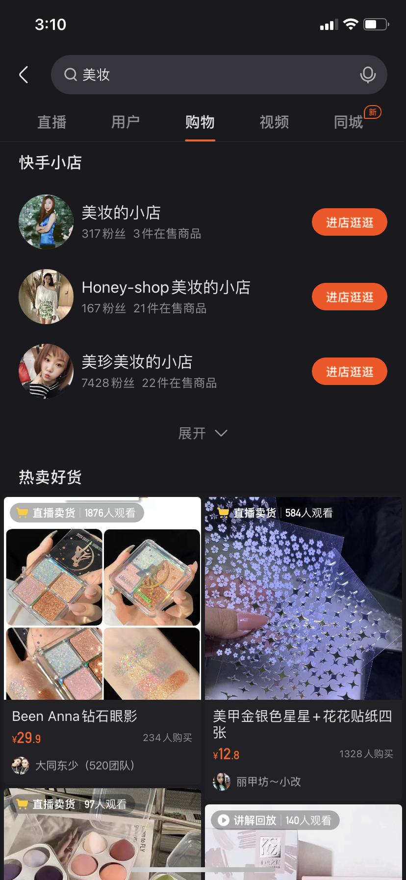 但目前的快手,在有意以产品为中心。在快手的搜索栏中,商品搜索结果后,点击“购物”,分为了“快手小店”和“热卖好货”两部分。这种以产品为中心的策略,很大程度上会稀释对主播的关注度,让用户的注意力回归到购买本身。
