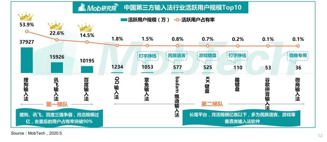 而这7亿用户中有90%被搜狗、百度、讯飞三雄“抢走”,剩下的小部分企业则通过自己的特色功能,例如打字赚钱、民族语言键盘、微商专用等功能去争取这10%的用户。