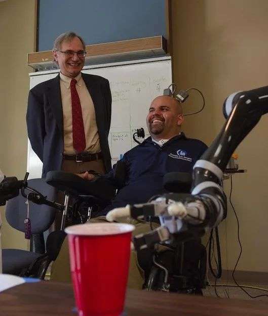 2015年,神经科学家Richard Andersen(左)发布的项目「教病人用意念控制机械臂」