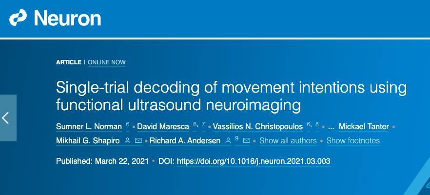 近日,研究人员在《神经元》杂志上发表了他们的成果Single-trial decoding of movement intentions using functional ultrasound neuroimaging,可以预测一个动作是左转还是右转,预测眼动的准确率约为78% ,手臂活动的准确率约为89%.