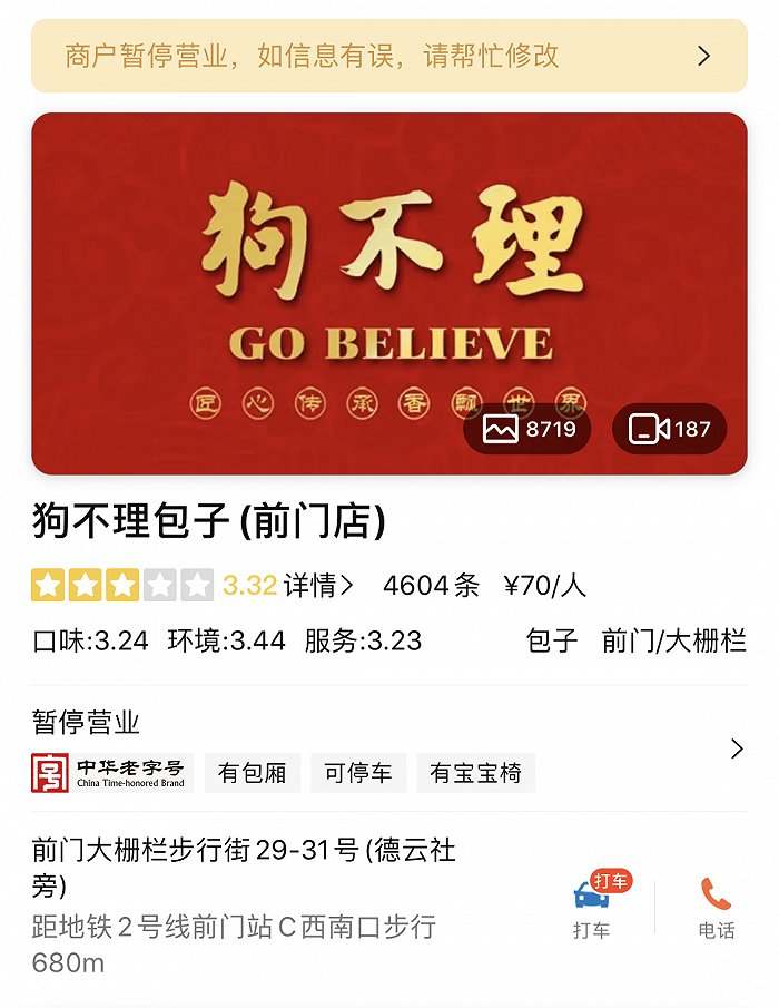 据《北京商报》报道,狗不理北京总店(前门店)大门紧闭、已经停业。界面新闻记者查询狗不理集团官网看到,狗不理前门店(北京)依然在列,但大众点评平台显示,这家门店已经暂停营业,门店电话也已无法接通。