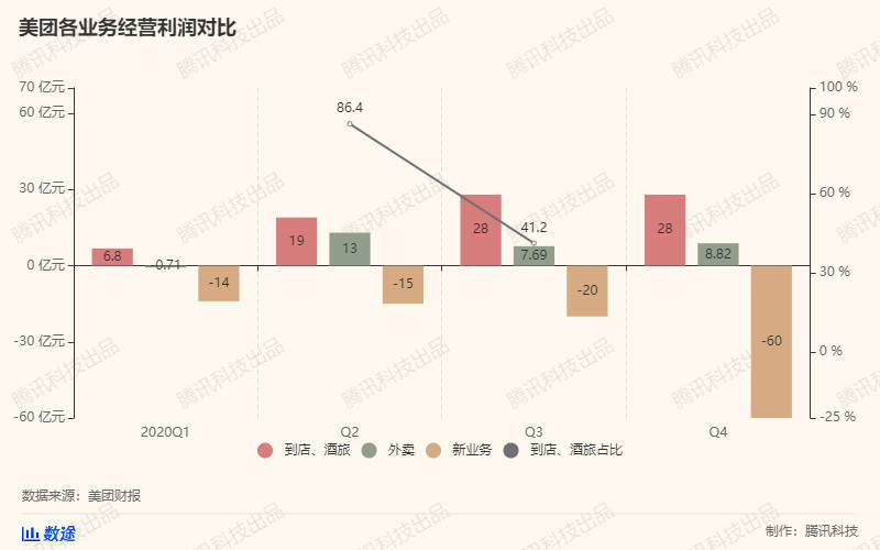 需要注意的是,2020年第三季度,美团经营利润为67亿元,但其中58亿元是来自投资收益,如果刨出去这部分收益,到店、酒旅业务的经营利润占比超过了100%。