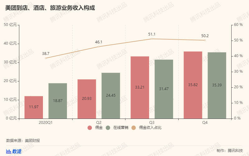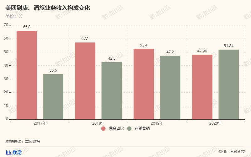 美团外卖变现的途径主要有佣金收入和在线营销服务收入(即广告收入),其中佣金收入远超广告收入。