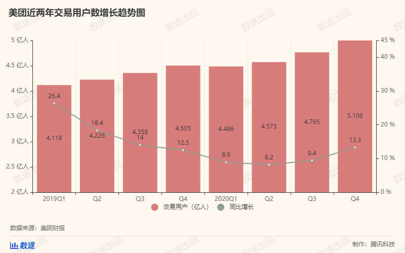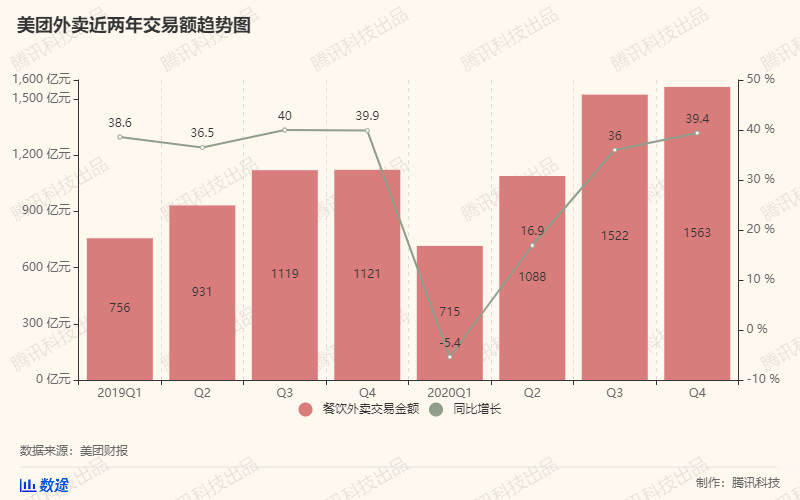 因此,外卖业务更应该关注是否为美团带来更多的活跃用户,为其他业务的变现、盈利创造机会。从上图美团交易用户数的增长情况来看,外卖业务还是很好地完成了任务,交易用户数首次突破了5亿,同比增速也超过了2019年第四季度的水平。