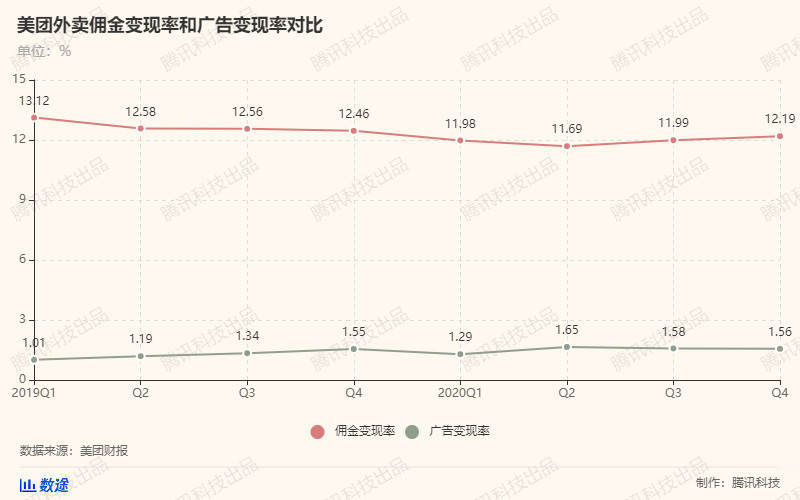 从上图可以看出,近两年美团外卖的佣金变现率呈现出一种下降的趋势,从2019年第一季度的13.12%,下降到了2020年第四季度的12.19%。这意味着一单100元的外卖,美团过去可以赚取13.12元的佣金收入,现在只能赚到12.19元。