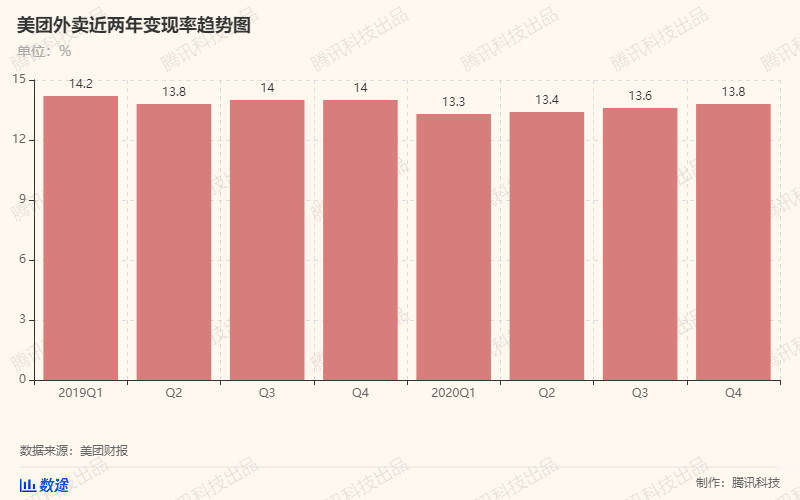 但美团外卖当前面临的最大问题就是:变现率(收入/交易总额)无法获得突破,甚至还有一点下降的趋势,从2019年一季度的14.2%,下滑到2020年第四季度的13.6%。