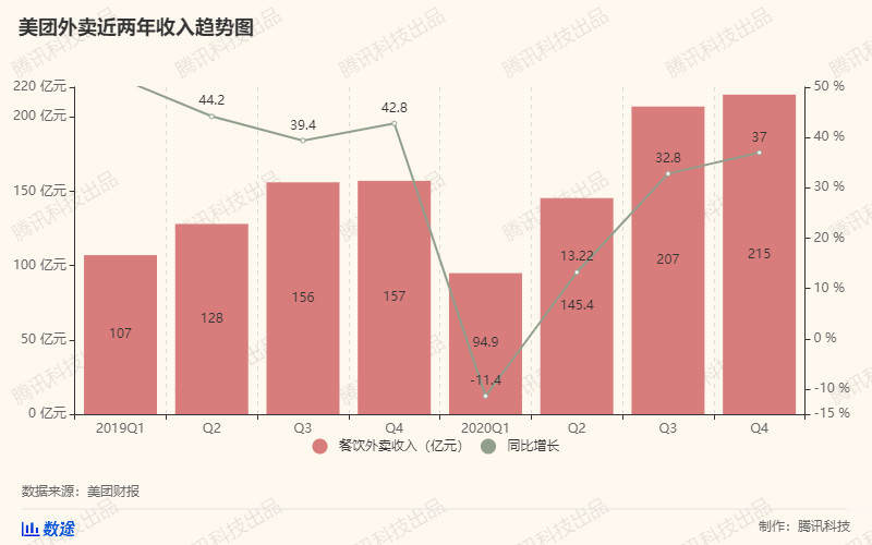 进入到2020年,除了外卖业务,美团不再公布交易总额,所以我们重点看下营收。从整体的感觉来看,美团的增长势头,已经接近疫情之前的水平,第四季度的增速达到了34.7%,2019年第四季度则为42.2%。