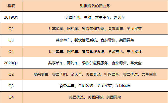 回答这个问题之前,我们首先要搞清楚,美团的新业务都有哪些?我们先从财报做一个直观的感受,从过去八个季度的财报来看,美团在新业务一栏当中提到的业务如上图所示,虽然共享单车提及的频率最高,但是已经明显可以感受到,进入到2020年,美团对食杂零售、社区团购、买菜一类的业务加大了重视。美团甚至在第三季度财报中提到,食杂零售业务是公司优先级最高顺序的业务。
