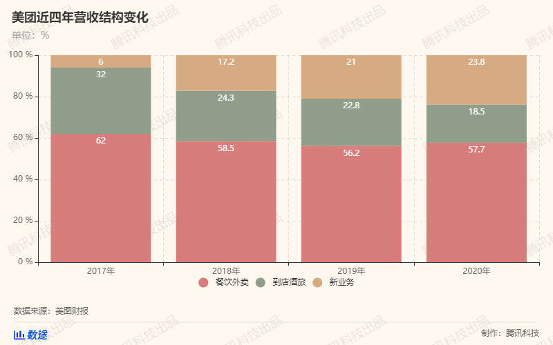 将时间拉长到四年来看美团营收结构的话,可以看到新业务的崛起非常迅速,从2017年的6%,一举增长到2020年的23.8%。