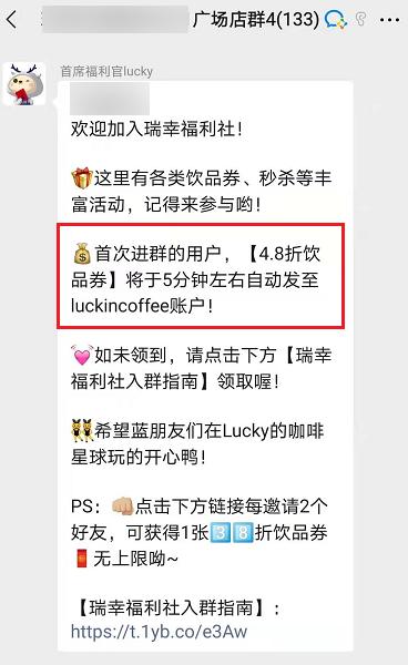 所以,一方面,瑞幸会不定期发布进群领优惠券的引流推文。