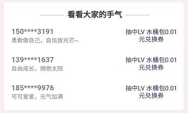 同时,你还可以在互动页面看到其他用户抽到 LV 的消息在疯狂刷屏,让你忍不住幻想自己也能抽到 LV 限量款,