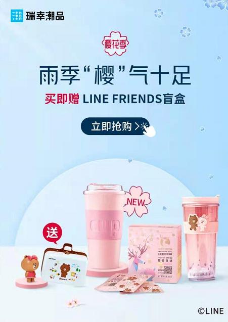 用户购买瑞幸“樱花”系列的杯子,就能够随机得到一个 LINE FRIENDS 的礼品盲盒,里面是一个价值 69 元的限量公仔。