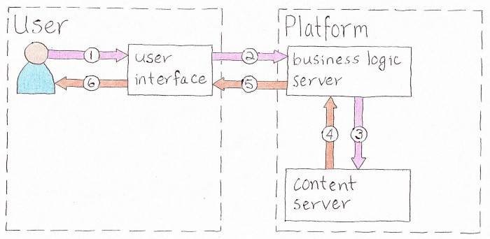图3简单演示了如何通过当前的中心化平台将内容交付给用户。用户通过用户界面发出请求,用户界面将请求传递到业务逻辑服务器(步骤1和2)。该服务器确定需要什么内容,然后从内容服务器获取它(步骤3和4)。然后准备好要显示的内容,并发送到用户界面,用户界面将其显示给用户(步骤5和6)。业务逻辑和内容服务器由平台控制,并在平台的计算机上运行,而用户界面(例如浏览器或应用程序)在用户的计算机上运行。