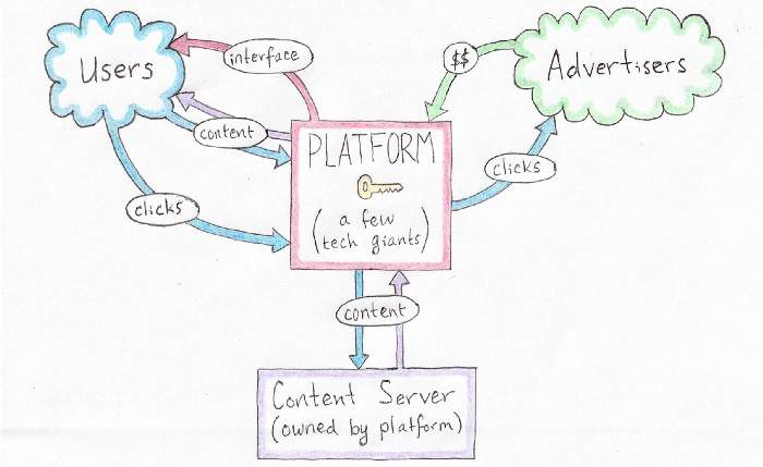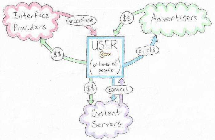 我们必须面对的事实是,钱是中心化的关键要素。用户带来广告主,广告主带来金钱,钱为服务的扩展和开发提供了经费,更好的服务带来了更多的用户。资金对于这种反馈回路至关重要,这种反馈回路将所有人吸引到同一个服务提供商,其真正的业务是为用户的眼球关注匹配广告。
