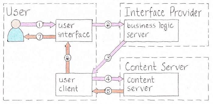 图4显示了这是如何实现的。用户再次通过用户界面发出请求,该请求被传递到界面提供商的业务逻辑服务器(步骤1和2)。然后,界面提供商将适当的业务逻辑发送回用户处的用户客户端(第3步)。用户客户端执行业务逻辑——根据需要从内容服务器收集内容——将输出发送到用户界面以显示给用户(步骤4至7)。在用户客户端和用户界面之间执行的步骤6是在用户设备上本地运行的。单个应用或带有去中心化社交协议插件的浏览器可以同时处理用户客户端和界面,因此从用户角度来看,用户客户端可能“隐藏在底层”。