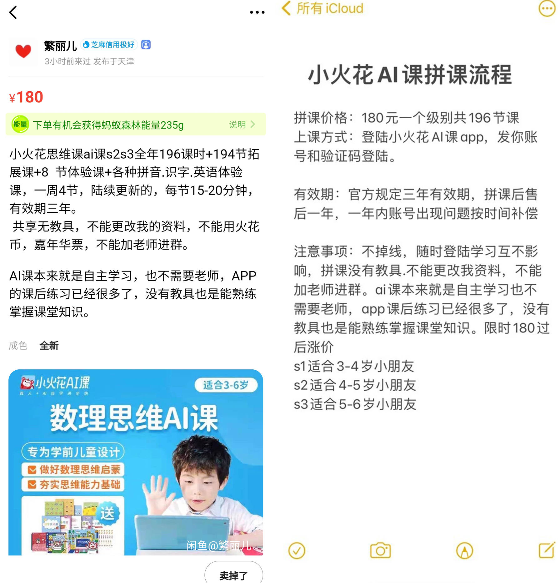 在闲鱼上便能搜到相关家长发出的拼课邀请,如用户“繁丽儿”表示,小火花思维拼课价格为180元,拼课家长可随时登录学习互不影响。