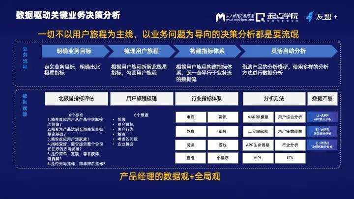看数据也不仅只看指标。任何一个产品需要以用户旅程为主线,以业务问题为导向去解决商业问题,并解决产品上线后的平稳运营和发展的问题。不以用户旅程为主线的数据分析都是耍流氓,数据分析绝不仅仅是BI分析师的工作。