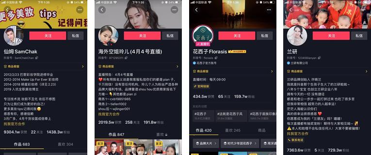 二、从账号分类看:有40%为由美妆红人转型为直播带货的账号,如@仙姆SamChak、@认真少女_颜九、@骆王宇等;也有通过打造国外生活背景,强调有一定供应链优势的综合类账号,如@韩国媳妇大璐璐、@海外空姐玲儿;最后就是一些品牌自播的代表,如@花西子Florasis、@理肤泉、@美宝莲纽约等,和一些深耕直播带货,有自主品牌、或供应链优势的带货账号,如@兰研等。