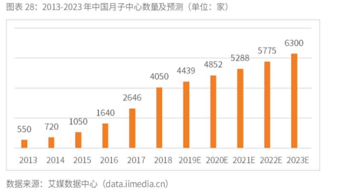 根据产业信息网发布的《2016-2022年中国月子中心行业研究与投资前景分析报告》,2020年中国月子中心市场规模约为150亿元, 年复合增长率达到42.45%。2013年到2018年,中国月子中心数量翻了超过7倍,从550间跃升至4050间,一线城市选择月子中心渗透率持续走高超20%以上,而地级城市需求也在逐年递增。预计未来中国月子中心市场规模近1900亿元。