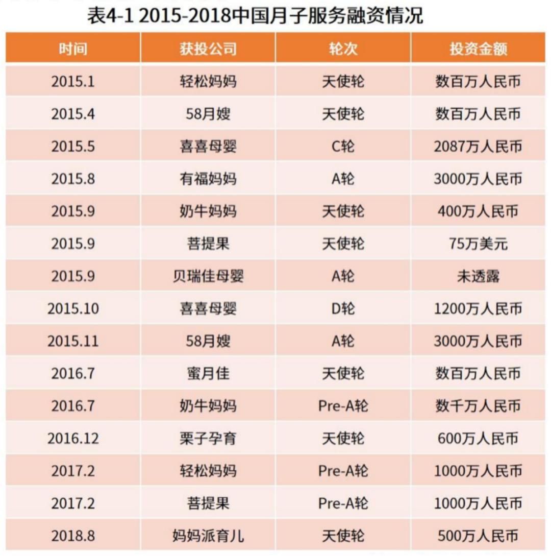 喜喜母婴、喜之家、福座母婴以及隶属于大美股份的大美母婴。不过截止2018年,这四家月子护理服务企业均未能实现盈利。