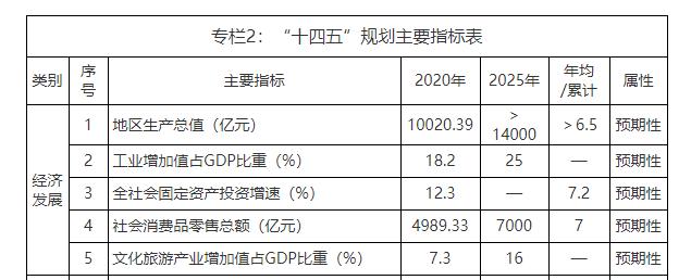 如文化旅游产业增加值占GDP比重,由7.3%增加到16%;国家高新技术企业数量由5200个,增加到12000个;进出口贸易总额由3473.84亿元,增加到4500亿元;