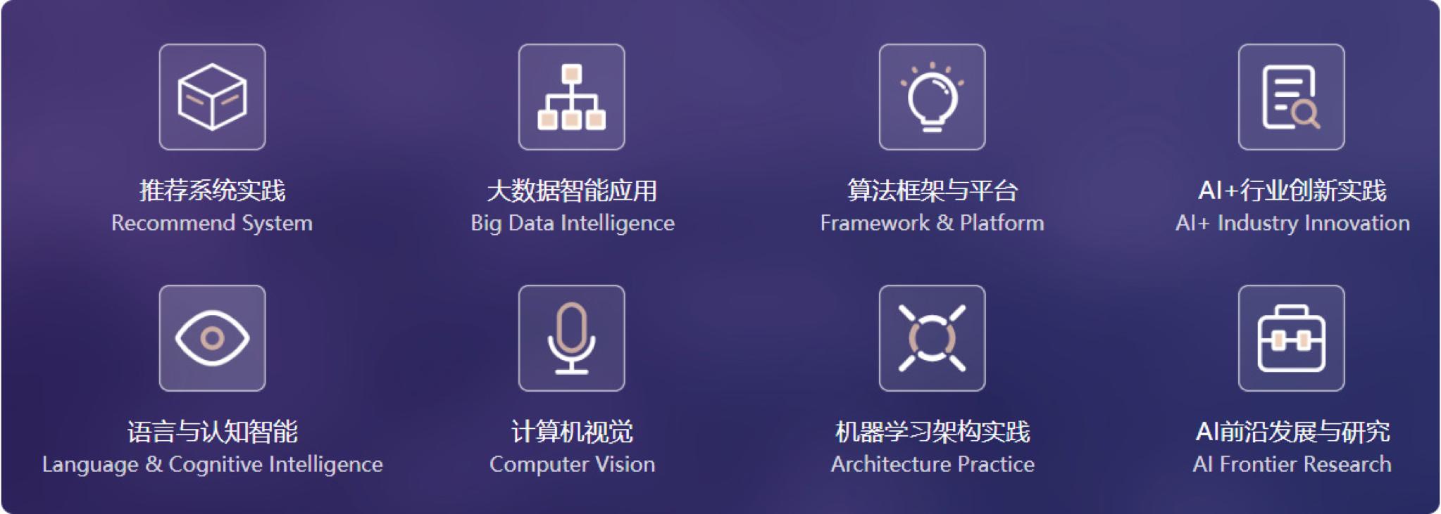 本次大会将聚焦推荐系统实践、大数据智能应用,算法框架与平台、AI+行业创新实践、语言与认知智能、计算机视觉、机器学习架构实践、AI前沿发展与研究等8大主题,为企业AI落地赋能。