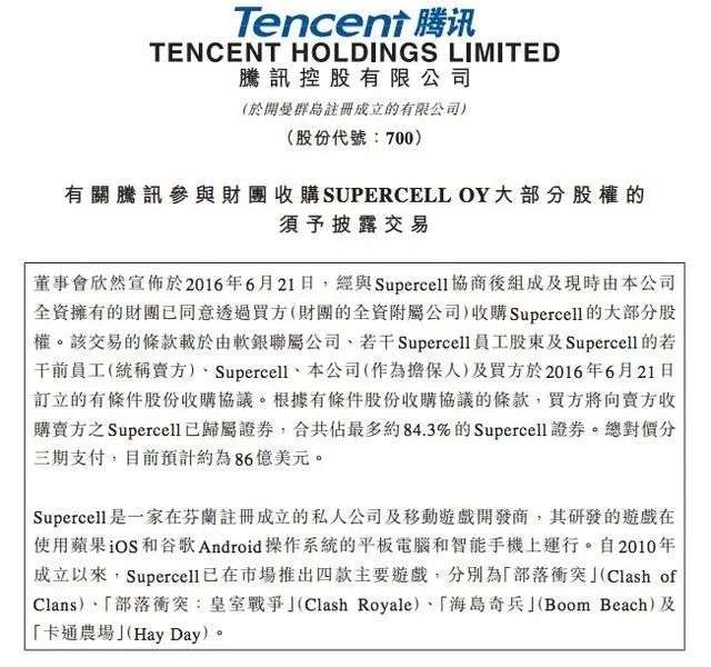 2016年6月21日,腾讯用86亿美元从软银手上收购了84.3%的Supercell股份,Supercell自此成为了腾讯财报的常客。