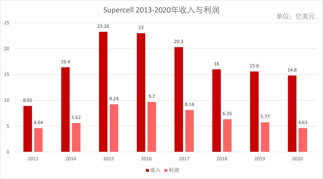Supercell的战绩无比辉煌,游戏营收从2013年的5.7亿美元到2015年的23.26亿美元,翻了4倍。在2016年被腾讯看中的时候也正值Supcell的顶峰时期,创下了9.7亿美金的利润。可也是从2016年开始Supercell的收入开始下跌,至2020年利润已经腰斩。