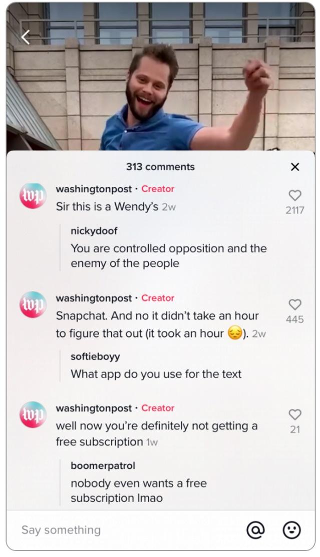 虽然雅虎新闻网站已经取消了评论功能,但是,Munslow说,在TikTok上,她优先考虑用户参与,鼓励评论和提问。“我们经常看评论,而且尽可能多地回复,回答用户的问题,或者展开更有趣、更轻松的对话。这表明我们是人,我们关心他们的生活以及与他们生活相关的东西。”