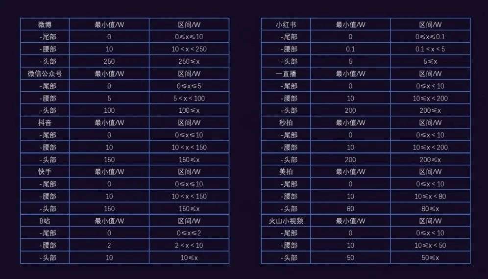 这份报告更细致,针对不同平台给出了不同的标准。比如,在微博,250万以上粉丝才叫头部账号,10万以上粉丝只是中腰部账号;而在小红书,5万粉丝就是头部账号,1000粉丝就算中腰部账号,可以接单变现了。这和业内实操也是吻合的,可见报告的专业性和严谨分析的态度。