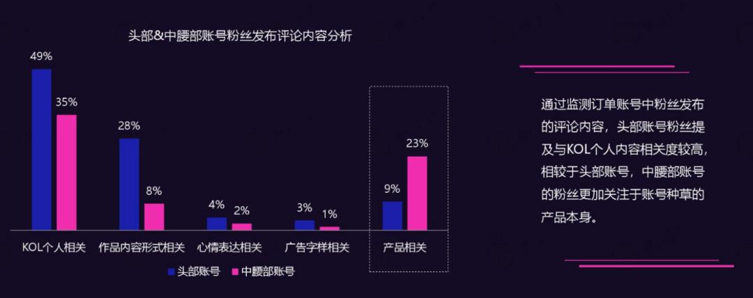 报告显示,对比投放头部账号和中腰部账号的评论内容,头部账号关注产品的仅有9%,相比之下关注KOL本人的高达49%,传播明显模糊了焦点。