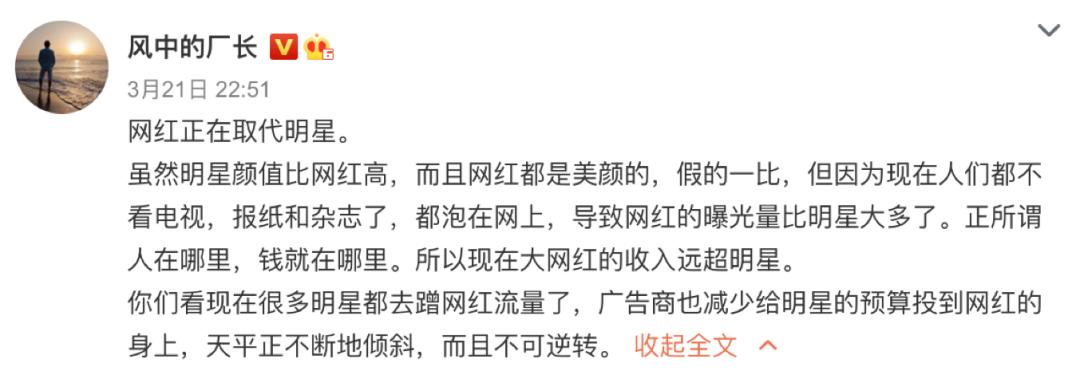 前两天,恰好在微博看到@风中的厂长也表达了类似观点,“ 网红正在取代明星”。理由是大家获取信息的媒介从电视报纸杂志,变成了社交网络上的智能推荐信息流,这让网红的曝光量比明星还大。