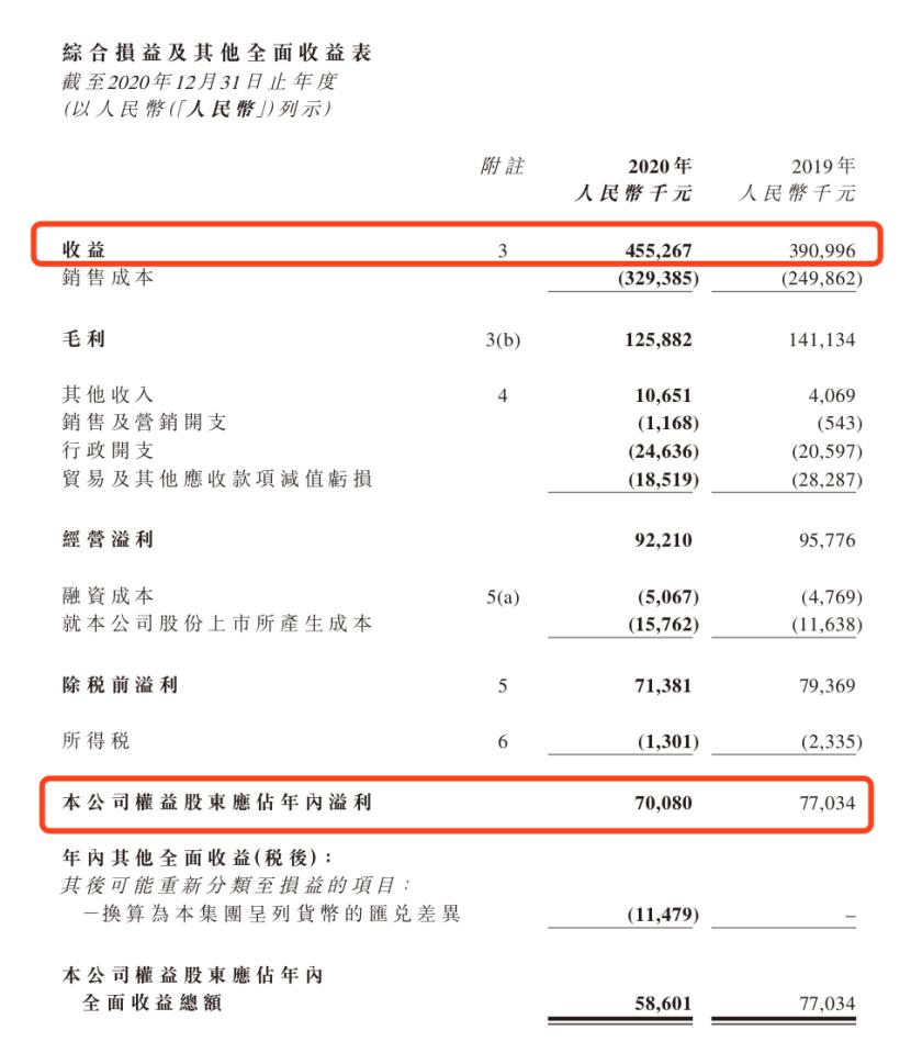 2020年,公司实现营收4.55亿元,同比增长16.4%;实现归母净利润约7010万元,同比减少约9%。如果不计上市开支的影响,经调整归母净利润约8580万元,比2019年减少3.2%。