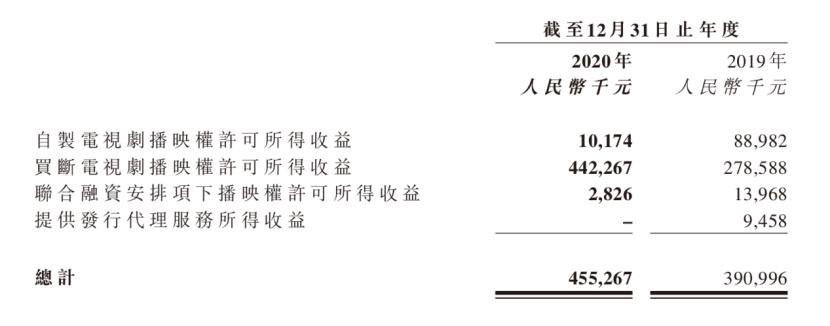 其中,前者收入从2019年的1400万元,减少80%至2020年的280万元,主要由于公司2020年仅获得一部来自联合融资安排项下电视剧的播映权许可收入。