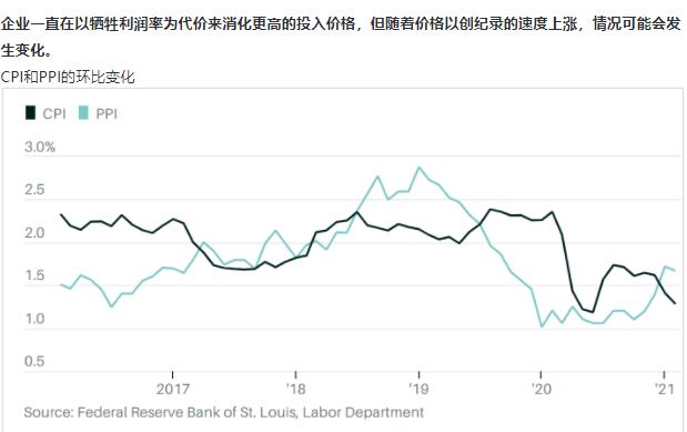 目前生产者价格指数(PPI)高于消费者价格指数(CPI),这是2019年7月以来第一次出现这种现象。笔者考察的数据是美国劳工部1月和2月公布的数据,虽然两个月还不会形成趋势,但这一现象反映出大量企业面临的定价压力越来越大,同时也表明至少就目前而言,企业正在吸收上升的成本,而不是将其转嫁给客户。