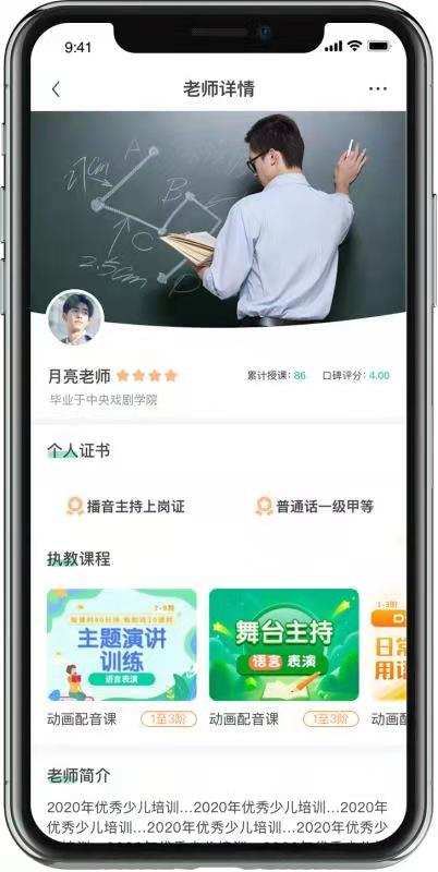 其三是师资力量,「口才喵」为了保障师资品质,要求语音类表演类老师全部要通过普通话一级乙等以上,100%师资有普通话二级甲等以上证书,另外,还设定了所学专业、学校、教师资格证、主持人上岗证等多个标签,对应相应的等级分,用户可以直接看到所有标准课程教师的等级分和口碑分,自由选择。