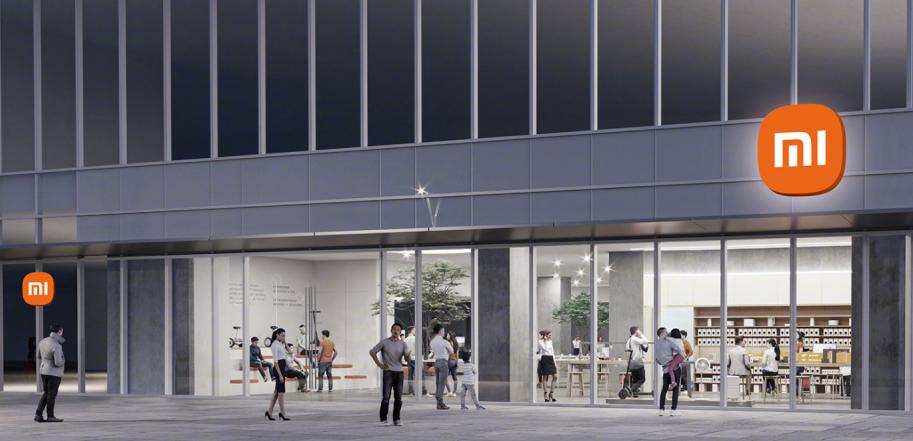 另外有变化的是小米 logo 的延伸使用,从效果图可以看到小米之家店头招牌的设计,更突出了 logo 的大小,以至于突破了招牌后面白色的长条框架。