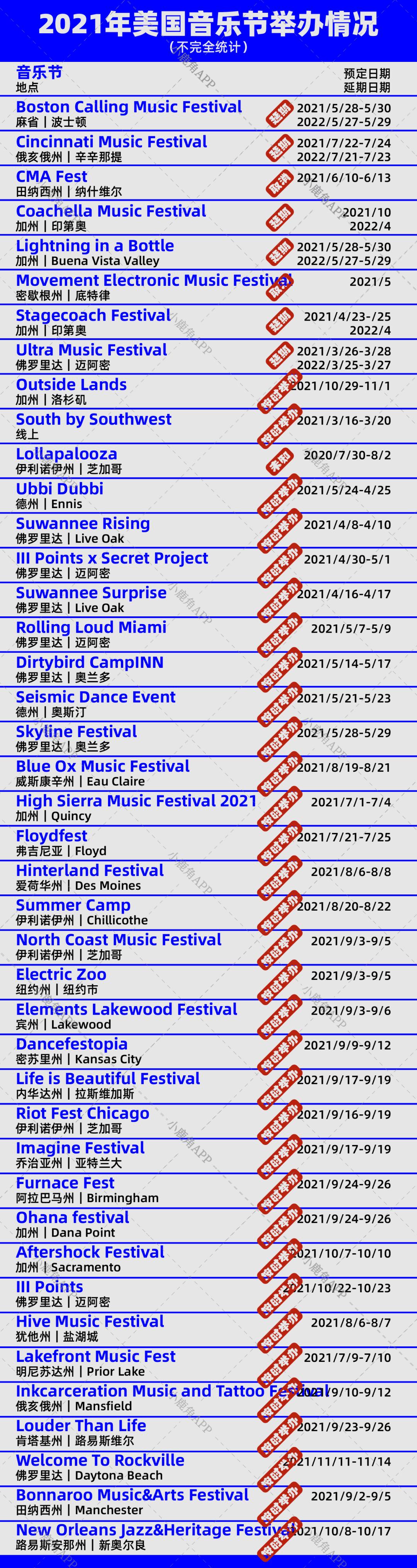 加州的Outside Lands音乐节、田纳西州的Bonnaroo音乐节和新奥尔良的爵士和遗产音乐节都已经推迟到秋季,届时全国美国大部分地区都将完成疫苗接种。